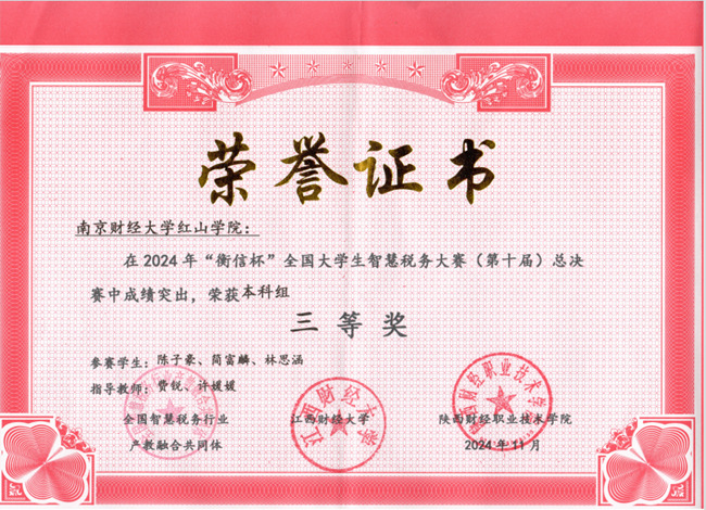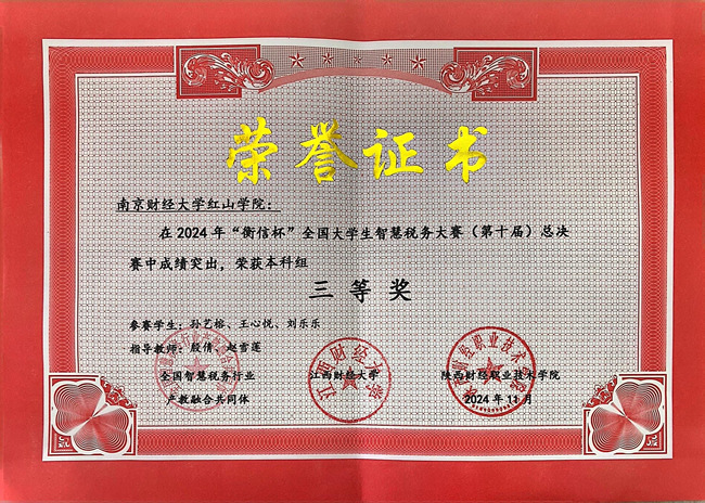 11月 25 日,由全国智慧税务行业产教融合共同体和江西财经大学主办、浙江衡信教育科技有限公司提供技术支持的“衡信杯”全国大学生智慧税务大赛(第十届)全国总决赛在江西财经大学成功落下帷幕。开云官网2支队伍取得全国总决赛三等奖的优秀成绩。
