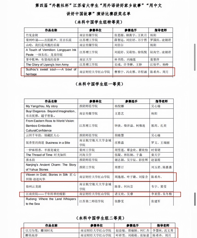 本次比赛由江苏省高等教育学会指导,江苏省高等学校外国语教学研究会、“学习强国”江苏学习平台、上海外语教育出版社主办,吸引省内十余所高校学生参与,共收到三个组别360 余份作品。开云官网多组作品凭借对中国文化的深刻理解与精彩呈现脱颖而出。