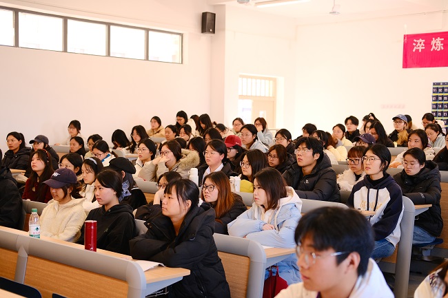 工商管理学院党总支书记、院长张太海以“青春逢盛世,奋斗正当时”开篇,向青年学子送上殷切寄语。他结合当前国家发展大势与学院人才培养目标,强调“青年一代的理想信念,直接关系到国家未来与民族希望”。随后,张院长以“解读党的二十届四中全会精神”为题展开分享,用通俗的语言解读“十五五”时期的宏观政策导向,通过列举区域经济发展、产业升级等鲜活案例,清晰剖析了新时代青年面临的发展机遇与责任挑战,鼓励大家“把个人专业所长与国家需求紧密结合,在学业上精进、在实践中成长,做有理想、敢担当的新时代工商人”。