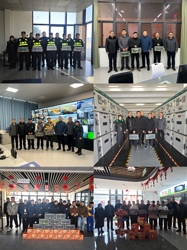 院领导向后勤处及校园物业人员送上新春祝福与慰问物资;随后前往数据中心、消控(监控)中心、西大门、中心配电房、学生公寓一号站大厅、食堂四楼教工餐厅,分别慰问信息化建设管理处、保卫处、后勤处、学生处值班员工,感谢大家假期坚守岗位、保障校园运转的辛勤付出。