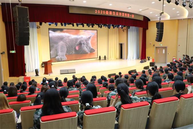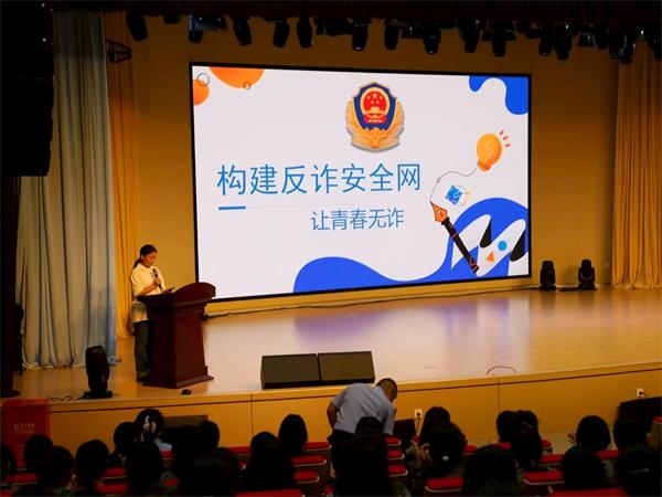 活动开场前,现场播放了反诈微电影《心防—重生之我在大学干反诈》。影片以贴近大学生活的剧情,生动呈现常见诈骗场景与手段,直观展现电信诈骗危害,快速吸引新生注意力,为后续宣讲做好铺垫。