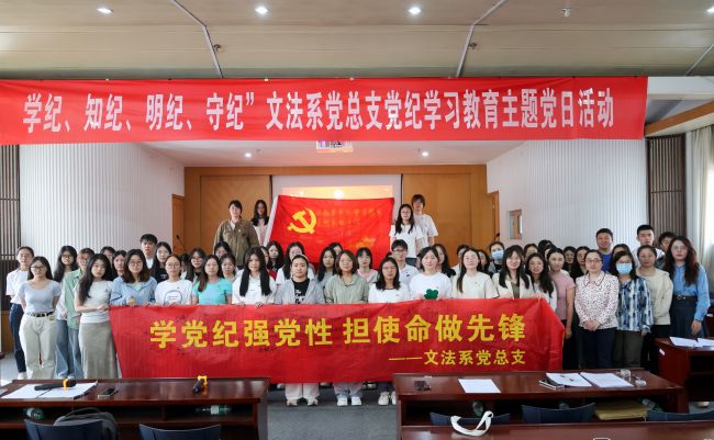 为深入学习贯彻习近平新时代中国特色社会主义思想和党的二十大精神,深入推进党纪学习教育走深走实,引导广大师生党员认真学习贯彻《中国共产党纪律处分条例》,5月22日下午,文法系党总支在桥头校区沐德苑报告厅举办了“学纪、知纪、明纪、守纪”党纪学习教育主题党日活动。文法系全体党员和党的发展对象、入党积极分子代表参加活动。