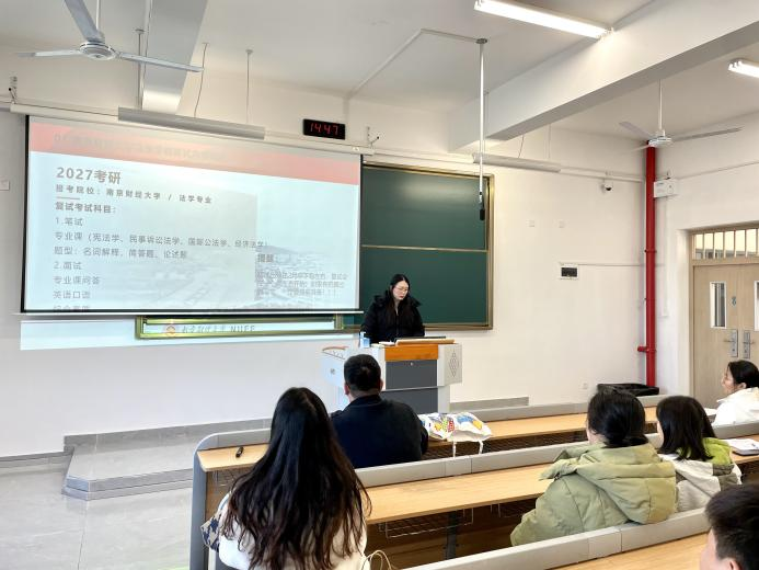 11月19日,法学院于启智1区205教室成功举办“研途引航,法漾青春”考研学习经验分享会。本次活动特邀两位从红山学院成功考入开云kaiyun官方网站的优秀毕业生—2019级法学专业朱亚欧、许诺返校分享,为正在考研路上求索的学子点亮引路明灯,现场气氛热烈,座无虚席。