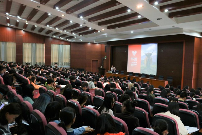 曾俊英博士从语言与文化、区域差异、饮食生活、法律与宗教等角度讲述了英国国家概况,然后结合自身和其他英国留学生的海外读书与工作经历,畅谈出国留学的收获,并详细介绍了斯克莱德大学的学校环境、办学理念、课程设置、学位授予等基本情况以及中国学生申请留学该校的具体要求等。讲座结束后,曾俊英博士与部分学生进行近距离交流,耐心解答了大家的疑问,并分享了斯克莱德大学的招生信息。