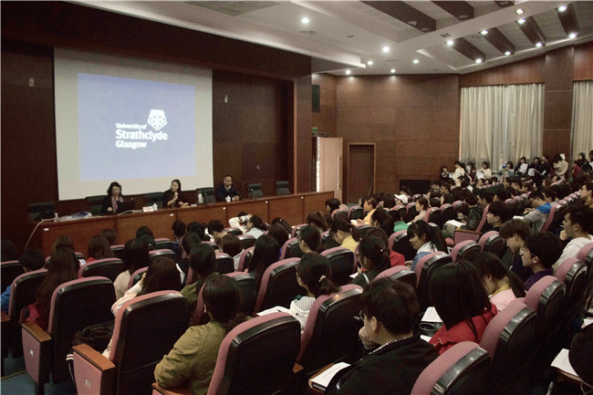 曾俊英博士以娴熟流畅的英文和生动有趣的PPT向同学们介绍了思克莱德大学概况以及苏格兰城市格拉斯哥人文、历史等多方面的详细情况,开阔了同学们的视野。随后,她阐述了选择留学思克莱德大学的四点原因:第一,思克莱德大学历史悠久,培养出了电视发明者John Logie Baird在内的众多优秀杰出人物;第二,思克莱德大学的研究成果丰硕,学科排名处于世界一流水平,尤其是商学院的工商管理专业,在英国排名第一;第三,思克莱德大学是个包容与开放的大学,曾俊英博士列举了在校外国学生人数和孔子学院的具体情况,表明其是中国学生留学的不二选择;第四,思克莱德大学设施先进,校园环境良好,图书馆馆藏丰富,宿舍条件优越。随后,她介绍了学校的报考条件,即雅思成绩在6.5以上且平时成绩在80分以上。最后,曾俊英博士向同学们说明了学校的学费和生活费用,建议同学们可以在不耽误学习的情况下勤工俭学,磨练自我。