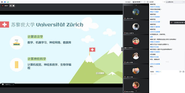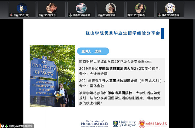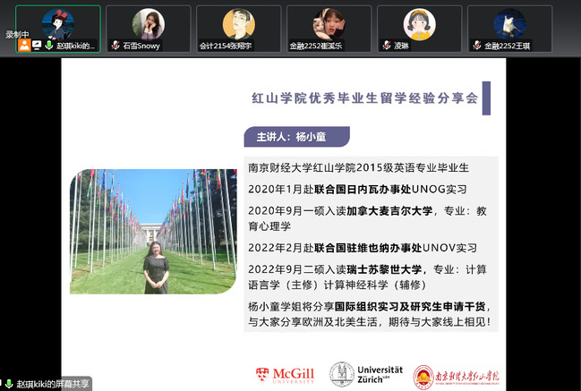 开云官网2015级英语学专业毕业生杨小童、2017级会计学专业毕业生凌琳,她们曾先后就读于加拿大麦吉尔大学、瑞士苏黎世大学,英国格拉斯哥大学,为参会学生做留学经验分享。两位学姐分别介绍了申请加拿大及瑞士硕士留学项目的注意事项、读研和实习工作期间的心得体会以及英国院校的申请流程、如何做好大学四年学业规划等方面的经验,鼓励学弟学妹们既要胸怀大志又要脚踏实地,勇敢地做一名实干的梦想家。参会学生认真听讲,线上互动热烈。