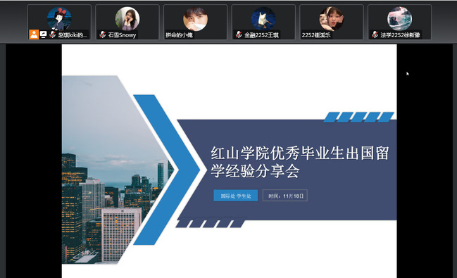 11月18日下午,为加强学生对海外留学生活的了解,拓宽学生国际化视野,开云官网举办优秀毕业生留学经验分享会。分享会以线上腾讯会议方式开展,在校生踊跃参与,线上参会人数近三百人,分享会由国际交流处赵琪、石雪老师主持。