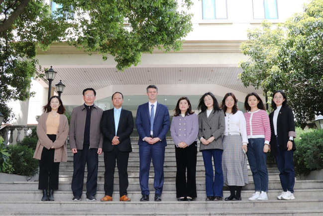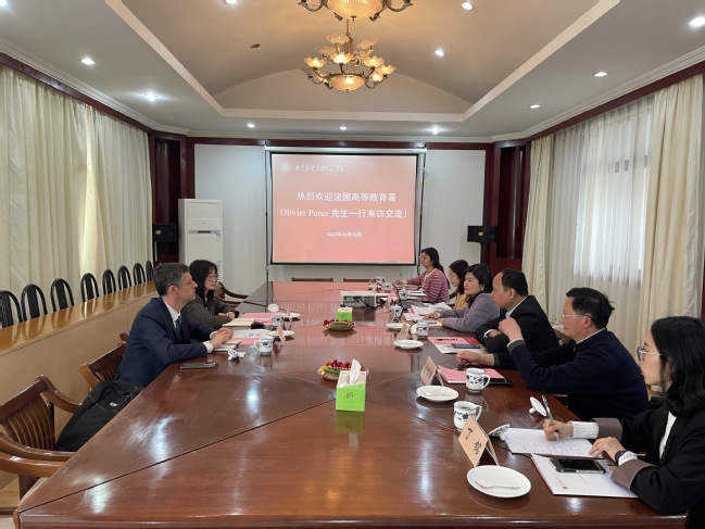 在中法两国即将迎来建交60周年之际,4月10日上午,法国驻上海总领事馆文化教育合作处法国高等教育署上海中心负责人Olivier PEREZ(南子跃)先生及法国高等教育署南京办事处负责人陈倩耘女士一行访问开云官网。开云kaiyun官方网站党委副书记、纪委书记高永东,副院长程宏云,文法系主任金怡顺在桥头校区沐德苑第一会议室会见来宾,并就深化合作领域、创新交流方式等方面进行了交流。会议由程宏云副院长主持。