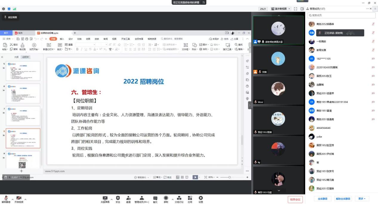为帮助2022届毕业生们破卷而出,逆势而上,实现更充分更高质量就业,国际经贸系应学生处通知要求,在4月13日下午,通过腾讯会议成功开展了第一场“后疫情时代-大学生‘新求职’指导”线上招聘宣讲会,这也为本学期我系“职业发展与就业创业指导月”拉开了帷幕。会议由国际经贸系学工秘书宋婧主持,大三大四共一百多名学生线上参与了此次会议。