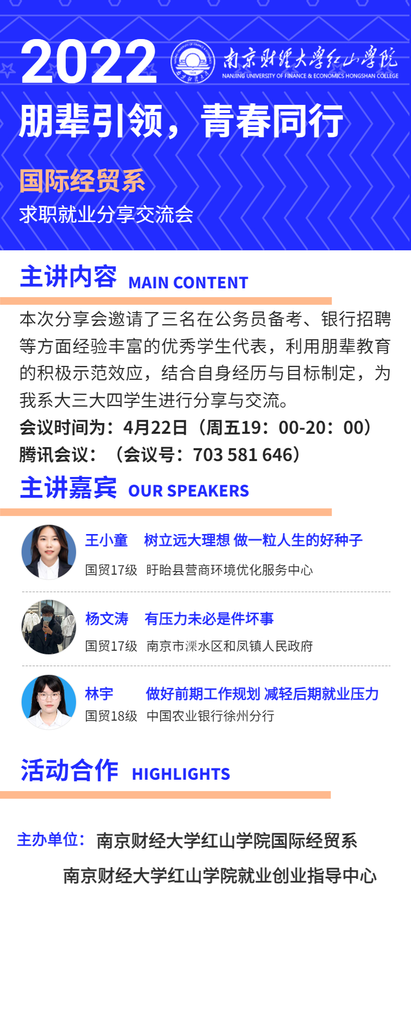 活动主题:“朋辈引领,青春同行 ”---国际经贸系求职就业经验交流会