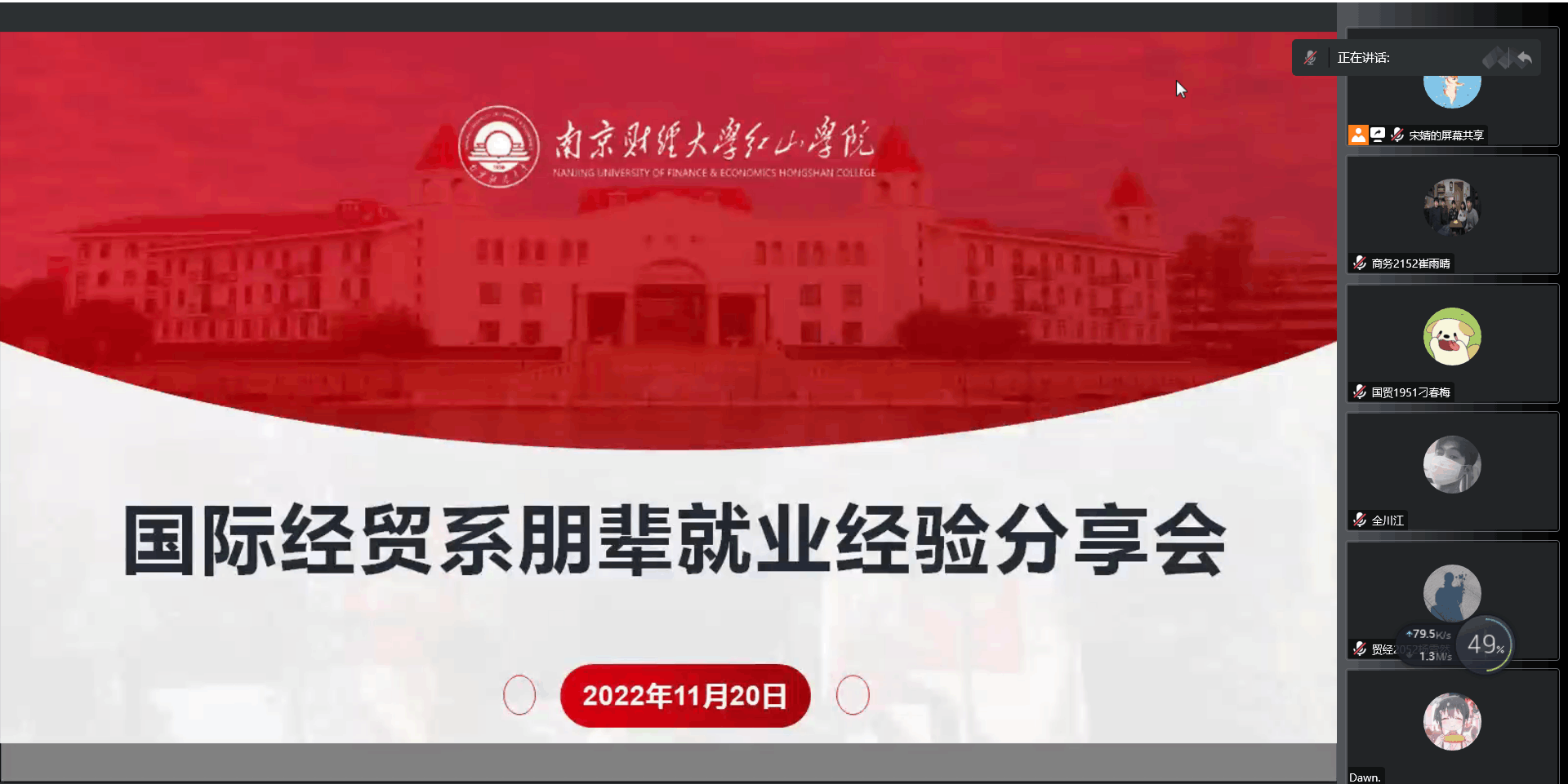 11月20日上午,应国际经贸系邀请,3名2022届优秀校友代表做客第一场“就业指导月”活动——朋辈就业经验分享会。此次活动由系学工秘书宋婧老师牵头组织并主持,我系各年级部分学生通过线上腾讯会议参会。