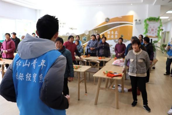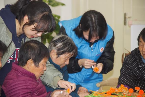 大学生志愿者教学老人制作柿子扭扭棒、示范“八段锦”养生操