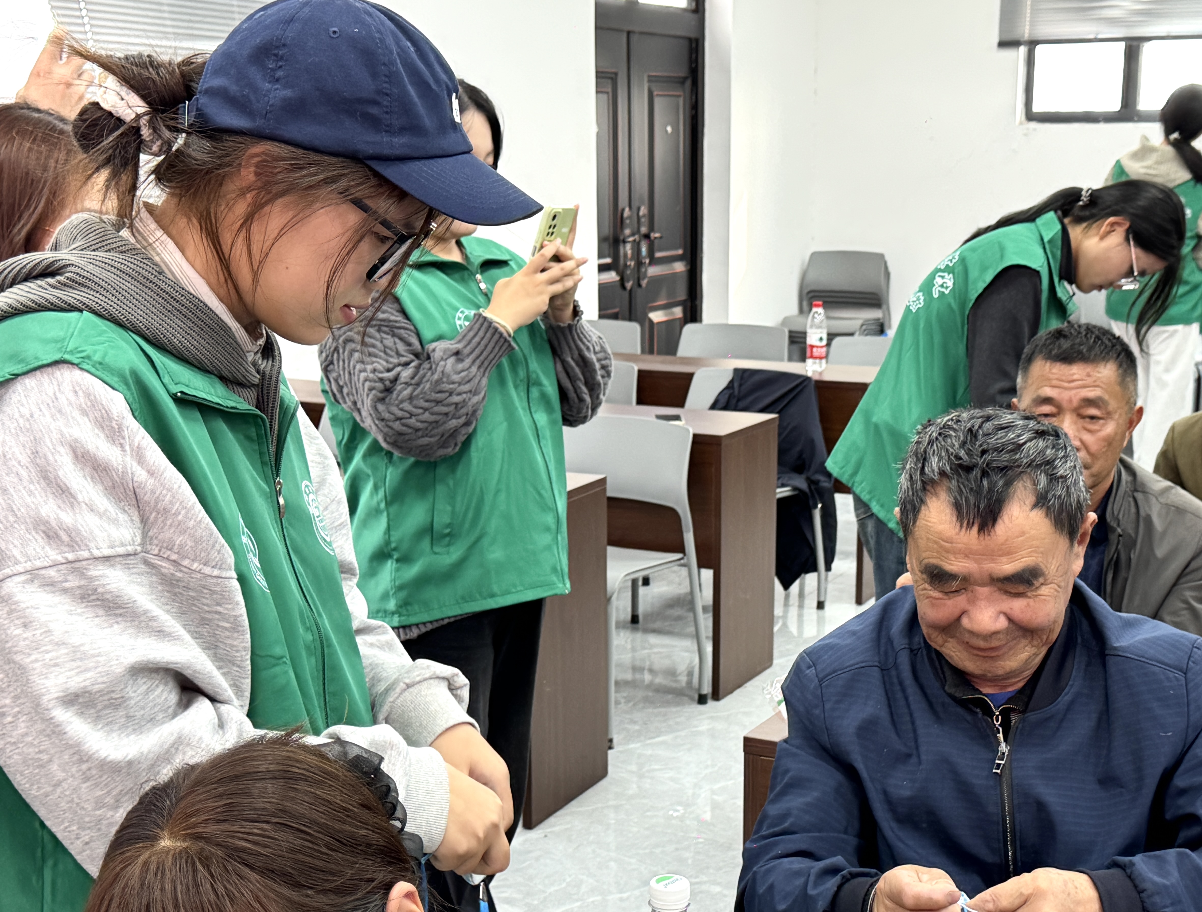 本次活动还注重传统文化与现代生活的融合。在“传承生活智慧,乐享绿色重阳”主题宣讲中,孙秋雨以有奖问答的形式激发老人们参与热情,大家踊跃互动,在轻松氛围中传递绿色生活理念。手工制作香囊环节将现场气氛推向高潮,志愿者们与老人一对一协作,耐心指导,共同制作充满祝福的香囊。指尖流转的不仅是茱萸的清香,更是两代人之间真挚情感的交流与传递。