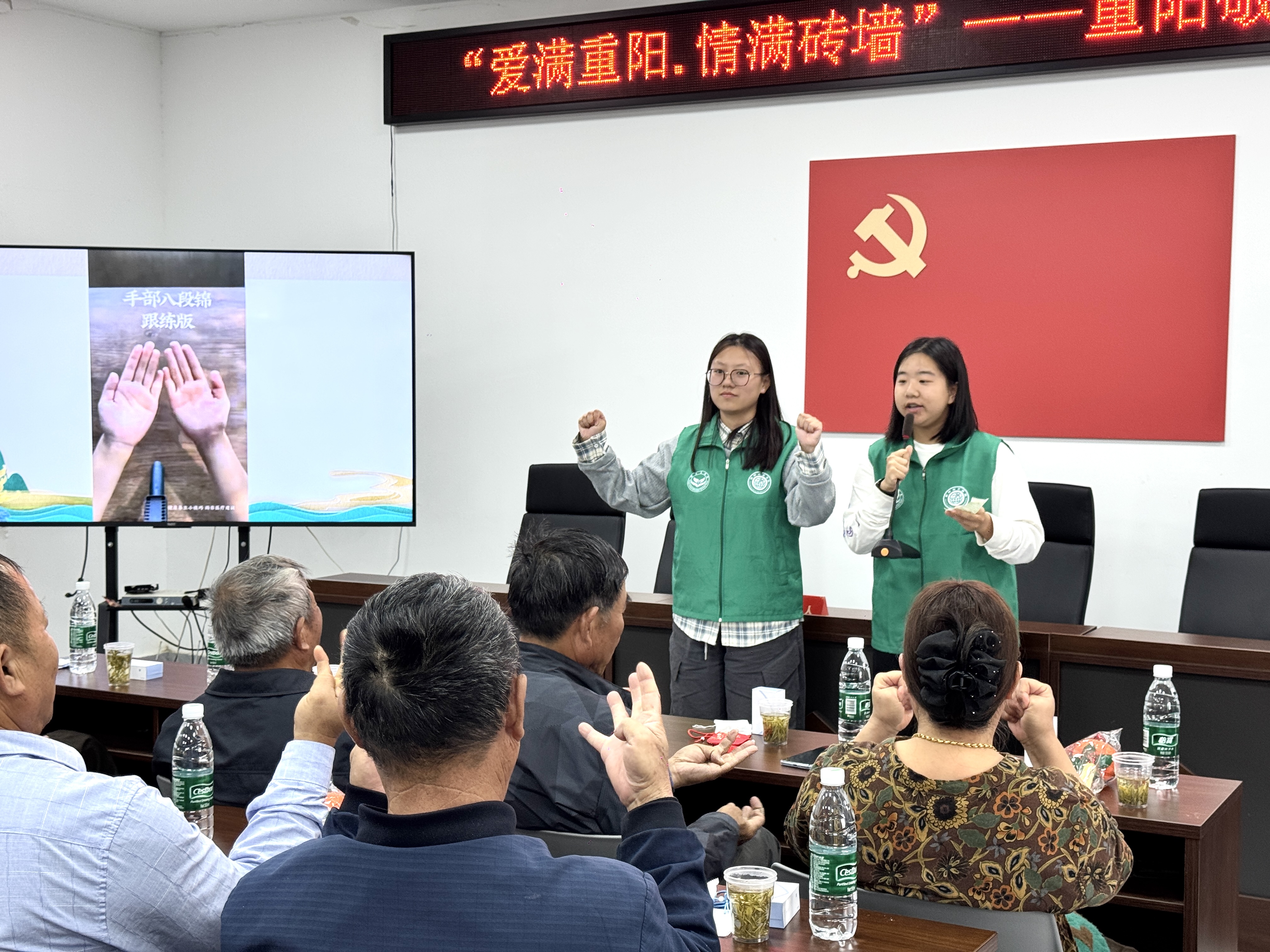 在主持人倪广鑫的开场介绍后,活动现场洋溢着温馨与感动。在“九九重阳,健康同行”主题宣讲中,李文馨以通俗易懂的语言为老人们讲解秋季养生知识,并通过轻松互动拉近了彼此的距离。随后的八段锦手部操教学环节,老人们跟随李越和蒋彤的示范认真学习,现场气氛活跃,笑声不断,一张张灿烂的笑颜成为秋日里最温暖的风景。