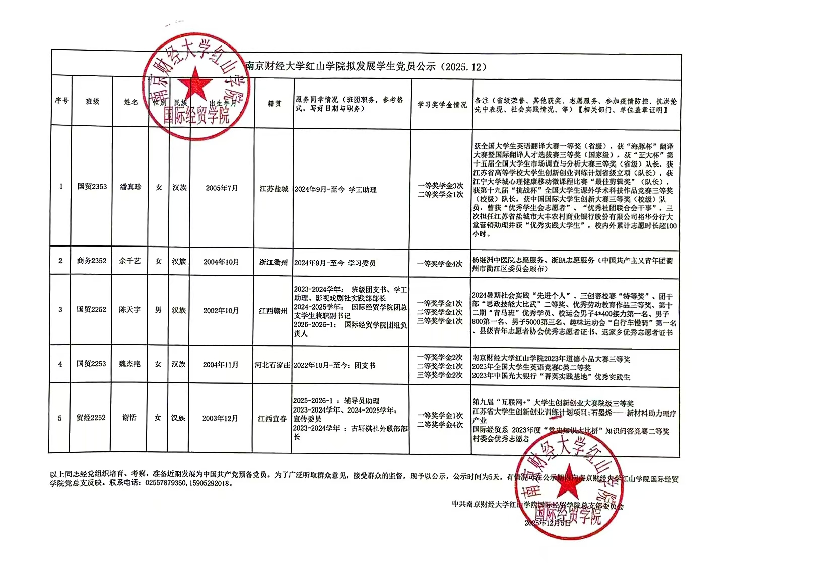 以上同志经党组织培育、考察,准备近期发展为中国共产党预备党员。为了广泛听取群众意见,接受群众的监督,现予以公示,公示时间为5天,有情况可在公示期内向开云kaiyun官方网站国际经贸学院党总支反映。联系电话:02557879360,15905292018。