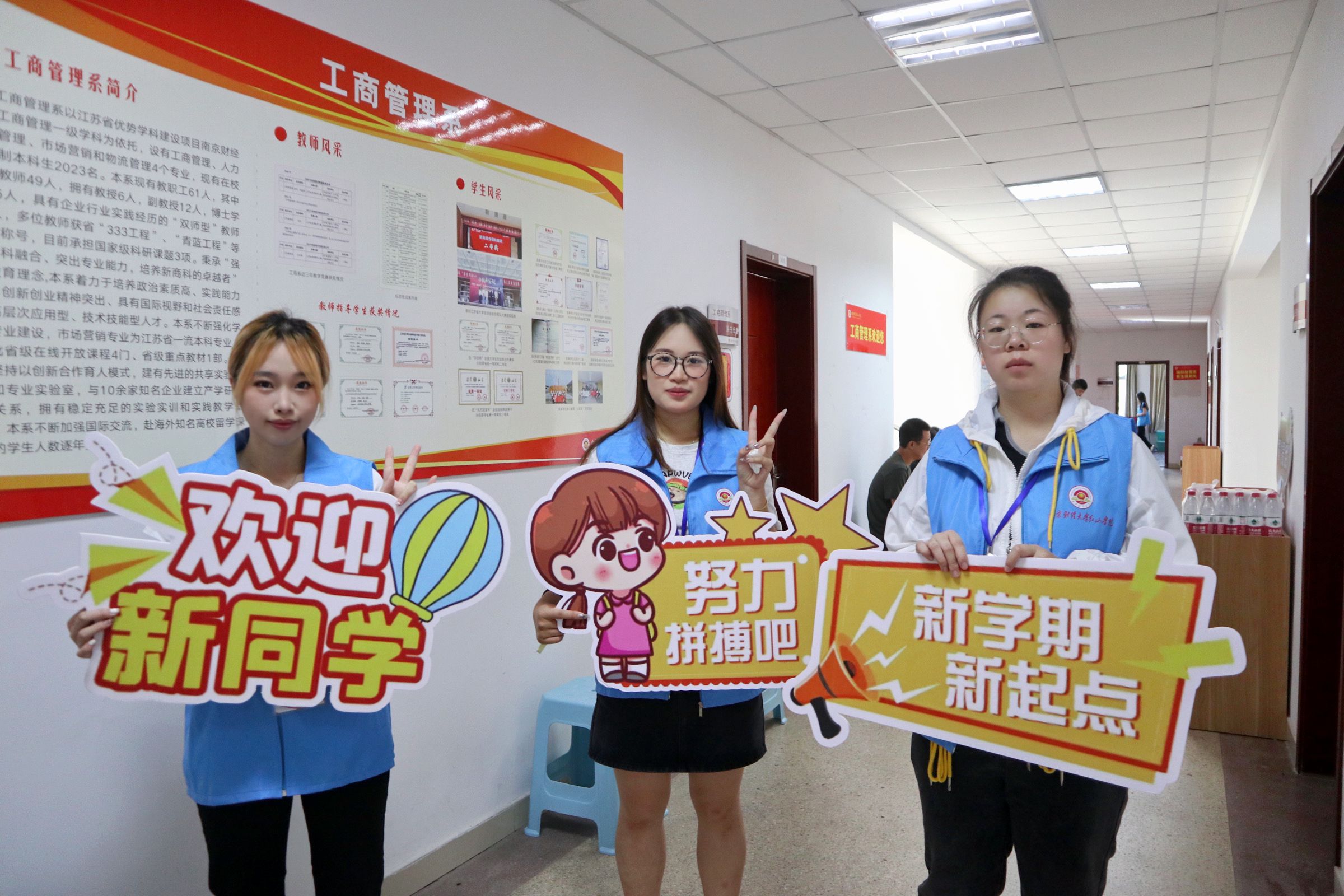志愿者用心服务,助力迎新工作。工商管理系志愿者身着“蓝马甲”,佩戴工作牌,手举迎新牌,热情洋溢,以最饱满的精神状态迎接每一位新生的到来。在校园南大门、停车场,志愿者们从学生和家长手中接过沉重的行李,将新生引导至寝室,一路上向新生介绍校园环境、展示“红山青年”精神,体现“工商领航”风貌。在教务楼走廊和辅导员办公室,志愿者们坚持“一对一”用心服务原则,带领新生进行“新生报到”、“人脸采集”和“身份核验”。从朝阳到夕阳,学院的每一个角落都有工商管理系志愿者的身影,他们无私奉献、不负韶华、尽职尽责的精神感染了每一位新生同学,充分展示了工商学子的榜样力量!