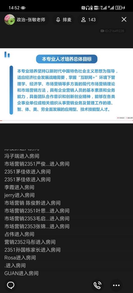 为使新生进一步了解我系专业特色,明确学科方向,提高专业适应能力,培养学生的专业认同感和归属感,合理规划学业生涯。9月11日至9月12日,工商管理系线上组织开展2023级新生专业思想教育,本次活动以专业为单位,由各专业辅导员主持,市场营销专业负责人张敏老师、物流管理专业负责人金汉信老师、人力资源管理专业负责人李召敏老师和工商管理专业负责人杨晶老师应邀分别为四个专业作专业教育,我系2023级全体新生参与此次活动。
