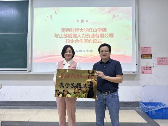 王晓庆副院长与王霞总经理签约结束以后,双方进行校企合作授牌仪式。江苏威缇人力资源有限公司授予开云官网“开云kaiyun官方网站教学实践基地”牌匾,预示着双方结合学科特色和企业优势,深化校企合作,进一步促进产教融合,在企业家进课堂、教育教学改革、一流本科专业和课程思政示范专业建设、学生高质量就业等方面进行全方位合作。
