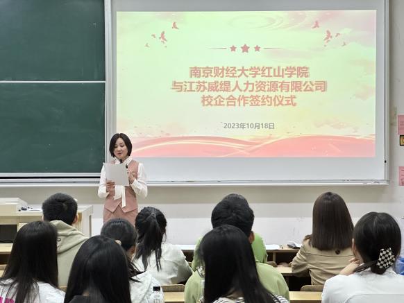 本次签约仪式由工商管理系党总支书记、系主任张太海主持,红山学院副院长王晓庆代表学院与南京市玄武区政协委员、江苏威缇人力资源有限公司总经理、南京绿色建筑建材协会会长、南京绿建科创产业园总经理王霞进行签约,工商管理系师生参加签约仪式。