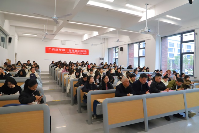 为提升学生新媒体运营能力,助力学生成长成才,12月13日下午,南京高职园联合高淳区供销社,邀请企业家走进校园开展职业生涯规划讲座。高淳区青年创业协会会长、江苏省互联网协会苏货直播孵化导师卞海波和南京三只河马电商总经理、南京晓庄学院新闻传播学院电商导师刘利云授课。南京高职园宣传科黄启睿,淳溪中心供销合作社理事会主任徐辉飞,监事会主任吴明敏,工商管理系党总支副书记王海萍,专任教师代表周柠楠参加。讲座由工商管理系团总支书记何玉凤主持。