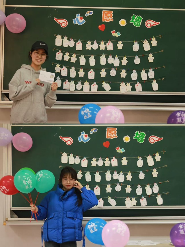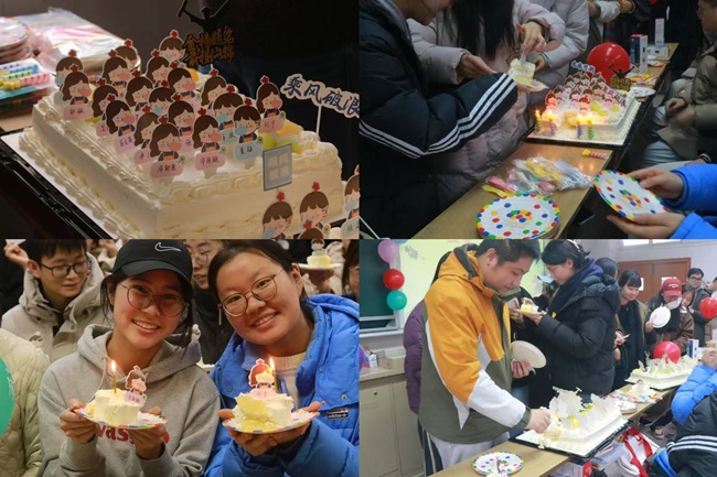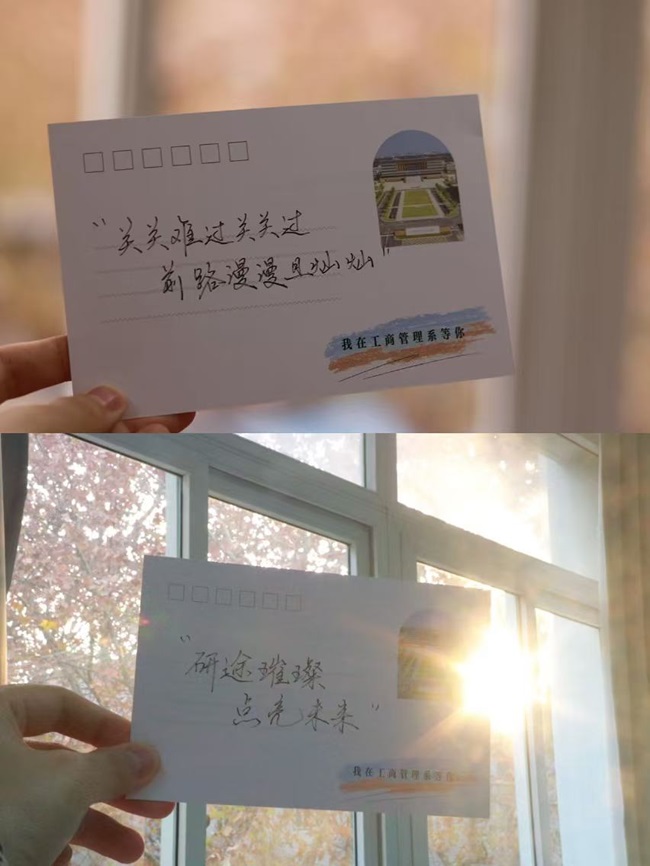 王海萍副书记和辅导员老师们为考研学子送上学院精心准备的考研大礼包。考研大礼包中的物品处处体现着“用心”和“暖心”,有保温杯、U盘、暖宝宝、暖足贴等实用物品,以及学弟学妹们精心制作的考研祝福明信片。这些小礼物体现了学院全体师生对考研学子的重视和祝福。集体写心愿墙环节,同学们纷纷在心愿贴上写下自己的目标院校和激励话语并挂到心愿墙上,心愿墙成为考研学子努力奋斗、勇敢追梦的见证。最后,工商管理学院还为考研学子精心准备了刻有全体学生名字的“全员上岸”蛋糕,祝福考研学子“蟾宫折桂,一举‘糕’中”。