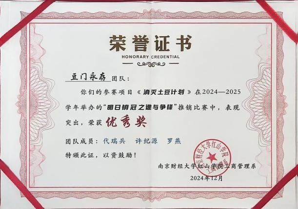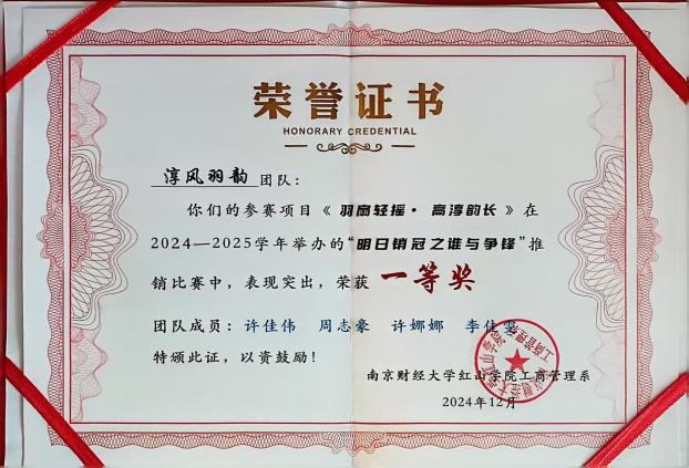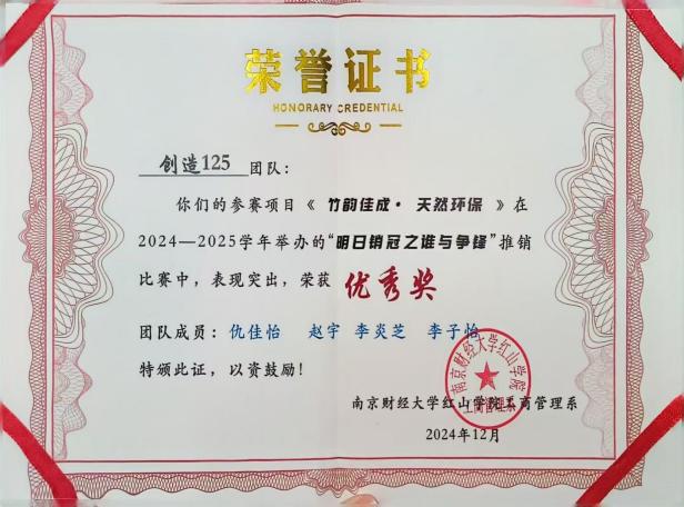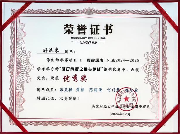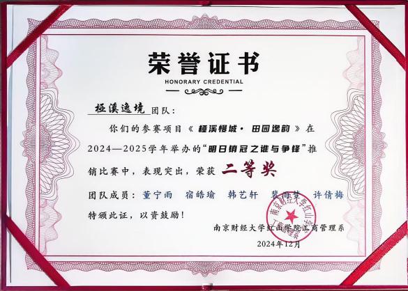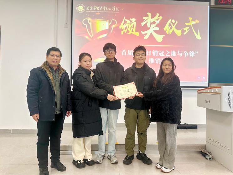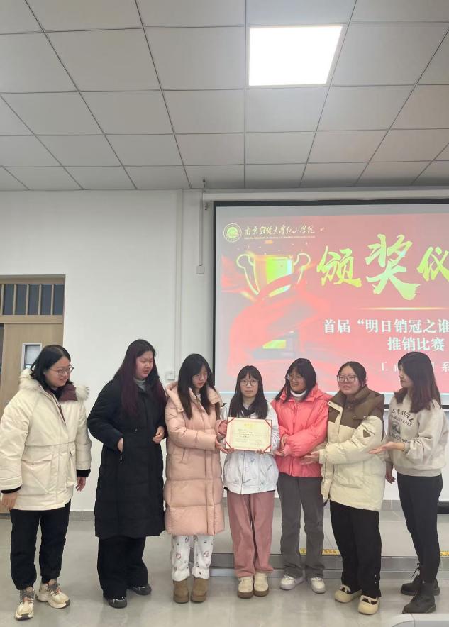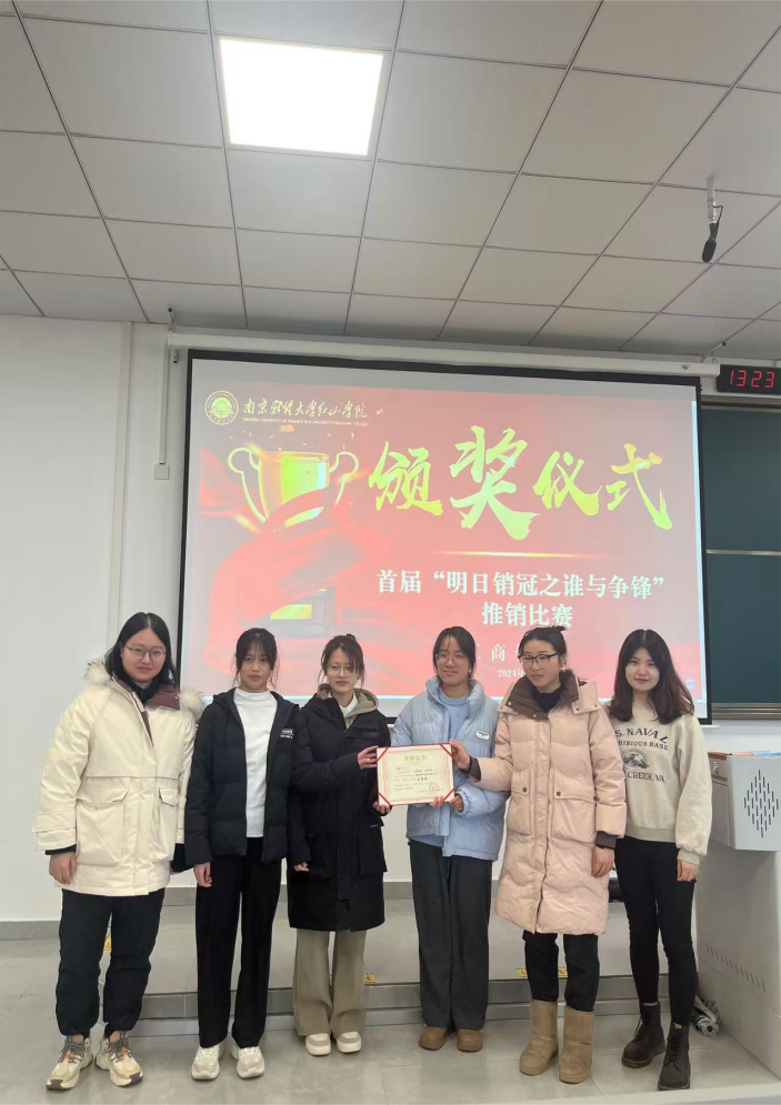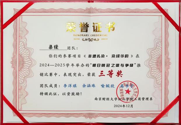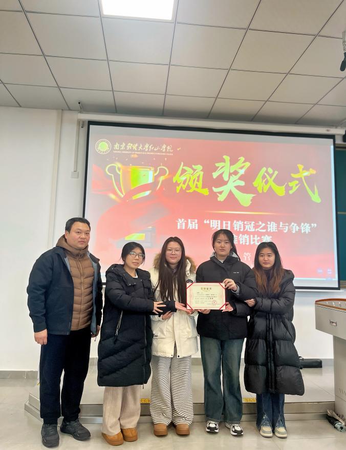经过激烈的角逐和评比,此次“明日销冠之谁与争锋”推销比赛由淳风羽韵团队(许佳伟、周志豪、许娜娜、李佳雯)荣获一等奖,其项目“羽扇轻摇· 高淳韵长”围绕高淳特色非遗文化,以历史悠久的羽毛扇制作工艺为核心,巧妙融合了传统与新型营销智慧,设计了创意十足的产品推广方案。桠溪逸境团队(董宁雨、宿皓瑜、韩艺轩、裴雨梦、许倩梅)荣获二等奖,其项目“桠溪慢城·田园逸韵”以高淳桠溪慢城旅游为主题,深度挖掘了桠溪慢城作为“国际慢城”的独特魅力,以情景短剧的新颖模式展示了旅游产品推广的新思路。染续团队(李洋琪、余涵珠、喻婉欣、高书宇)荣获三等奖,其项目“非遗扎染·染续华韵”围绕高淳扎染非遗技术,通过策划“非遗进课堂”活动、设计扎染风格的名片海报等形式全方面展示产品的特色。除此之外,本次比赛还设置了优秀奖,由创造125团队、好运来团队、豆门永存团队获得,旨在鼓励这些团队在推广非遗文化、创新营销策略及提升产品附加值方面所展现出的积极态度和不懈努力。