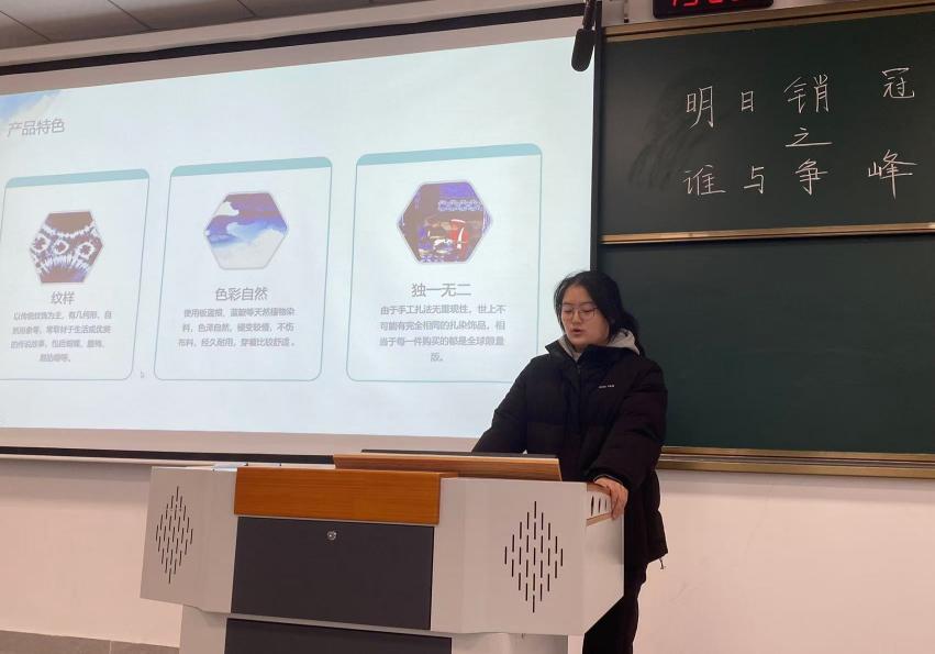 此次比赛分为初赛和决赛,初赛共有20组同学参与,通过逐一展示和优选后,最终有8组选手进入决赛。赛中,各参赛小组代表针对市场形势、目标客户、产品特色、竞争环境等方面对选定商品进行了详细分析,结合自身优势,策划出具有可行性和现实价值的推销方案。