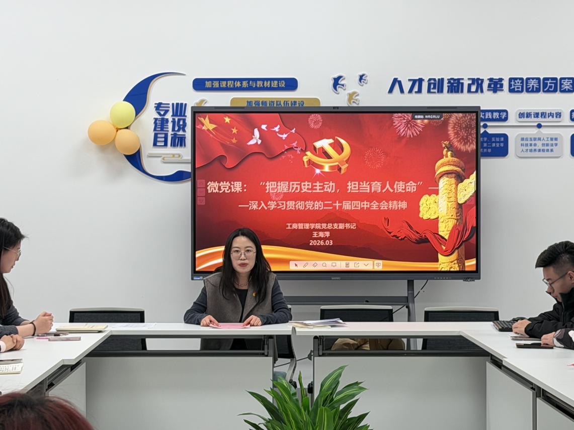 工商管理学院党总支副书记王海萍以“把握历史主动,担当育人使命”为题讲授微党课,结合党的二十届四中全会精神,强调高校党员教师与学生骨干应立足为党育人、为国育才使命,在历史方位中找准定位,以主动担当服务学院高质量发展。