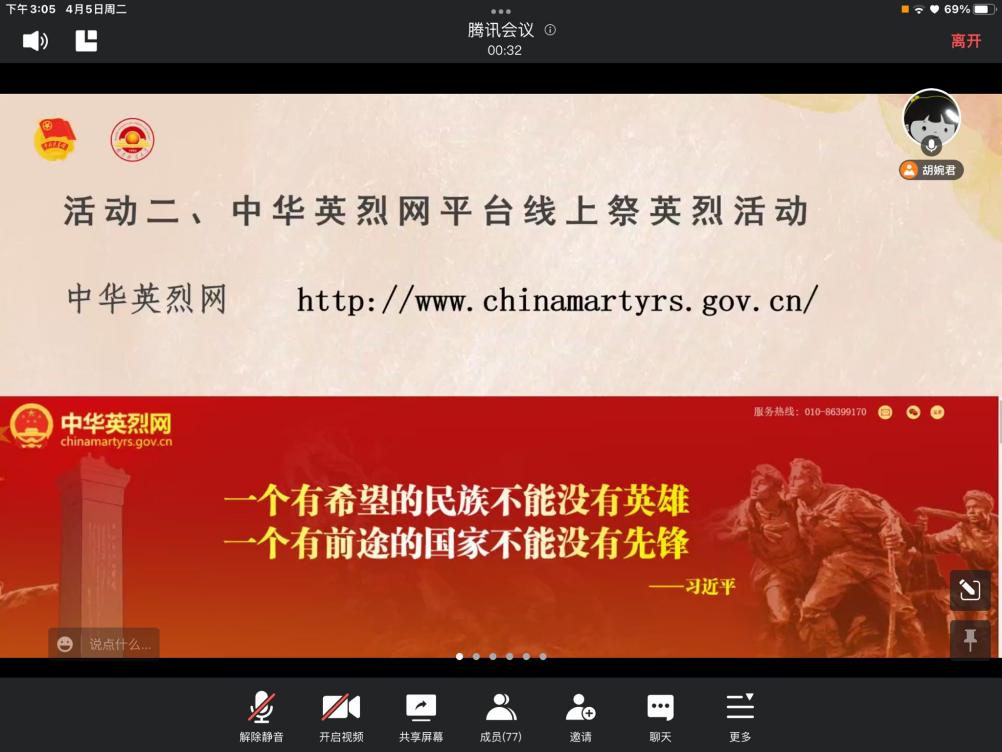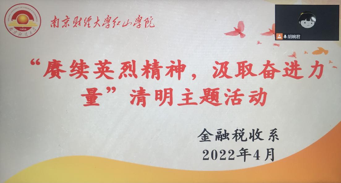 为缅怀革命先烈,弘扬爱国主义精神,加强四史教育,4月5日下午15时,金融税收系团总支举办了以“赓续英烈精神,汲取奋进力量”为主题的清明缅怀先烈活动。金融税收系团总支书记胡婉君,团干部及部分党员参加此次活动。活动以线上形式开展。