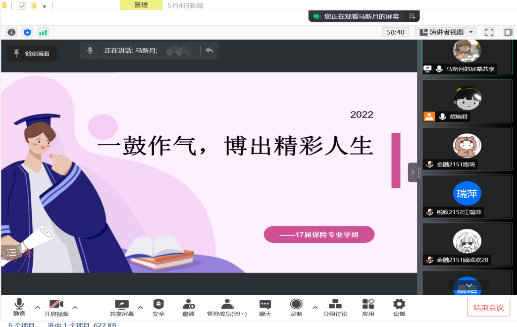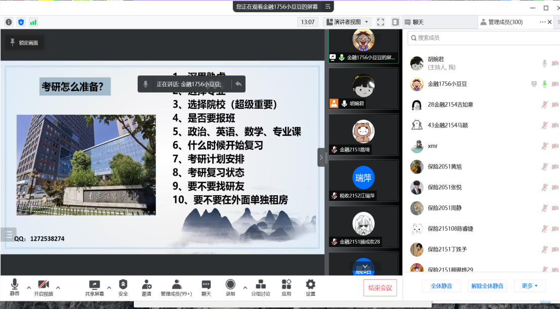 金融1756班郭余豪校友分享了如何充分做考研准备及就业考虑,从十个方面进行了分析;保险1751班马新月校友就教师资格证、教师编制备考做分享,提醒有教师梦想的学弟学妹们认真复习,并围绕备考、实习、网申面试的心路历程与方法技巧,提供经验指导与交流;金融1751班崔明聪校友从自身考研、考编的摸索历程直至考取银行的求职经历,告诫在听同学要树立正确的择业观,避免盲目跟从。