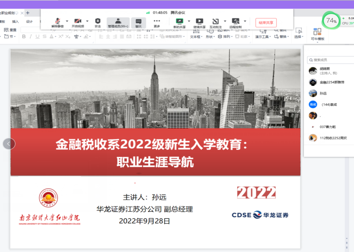 9月29日下午,我系举办2022级新生入学教育之职业生涯导航在线讲座。华龙证券江苏分公司副总经理孙远先生应邀主讲。讲座由金融税收系学工秘书兼团总支书记胡婉君老师主持,我系22级新生在线聆听。