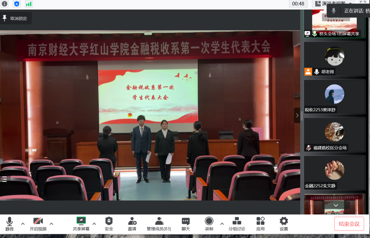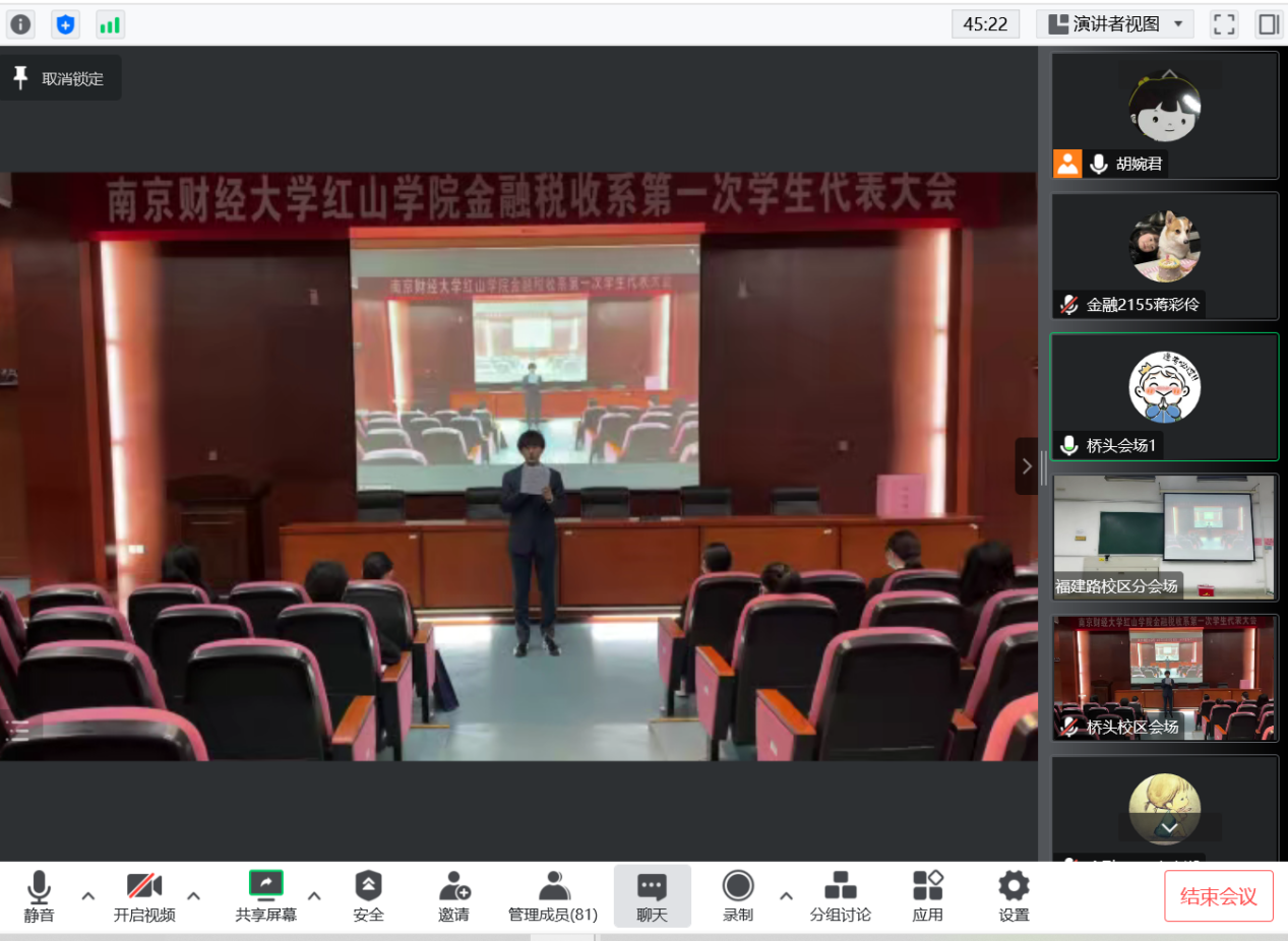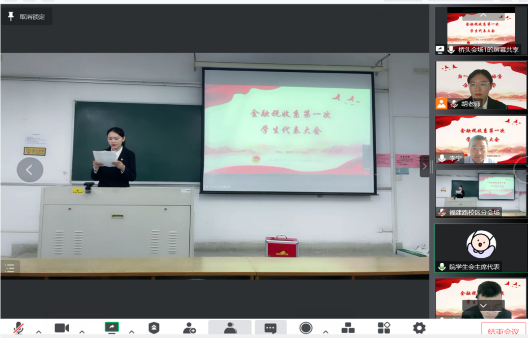 在遵守学校最新防疫要求的前提下,福建路校区在J2-302教室设分会场同步直播。除两校区学生会工作人员在场外,其余学生代表均以腾讯会议的形式线上参会。