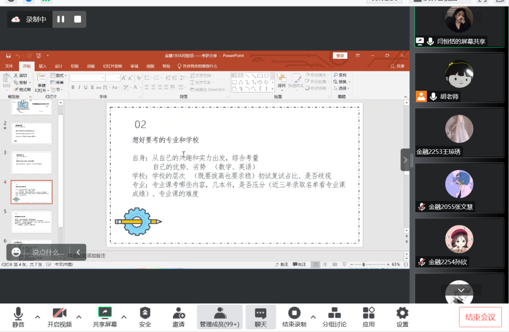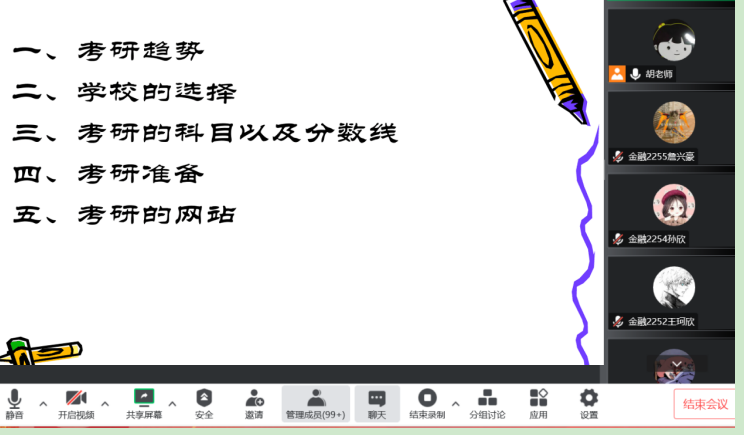 11月19日下午两点,金融税收系通过腾讯会议平台举办“研途”有你考研线上交流会,此次会议由金融税收系团总支书记兼学工秘书胡婉君主持并主讲,同时邀请了3名优秀往届生代表做经验分享。金融税收系学生在线上积极参与,交流会顺利举行,同学们表示受益匪浅。