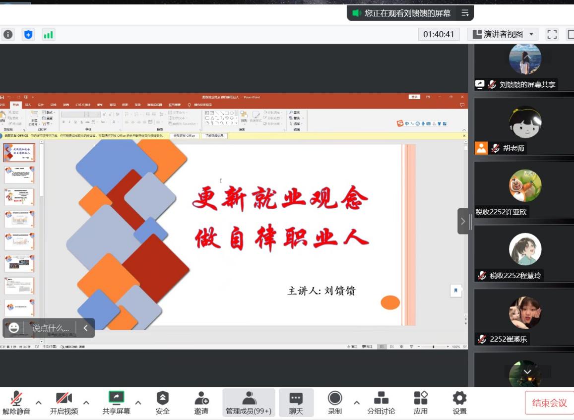 11月20日下午,我系邀请资助中心主管刘馈馈老师,开展题为“更新就业观念,做自律职业人”讲座,为我系学生做就业指导。本次讲座由我系学工秘书胡婉君老师组织并主持,我系学生积极参加线上会议。