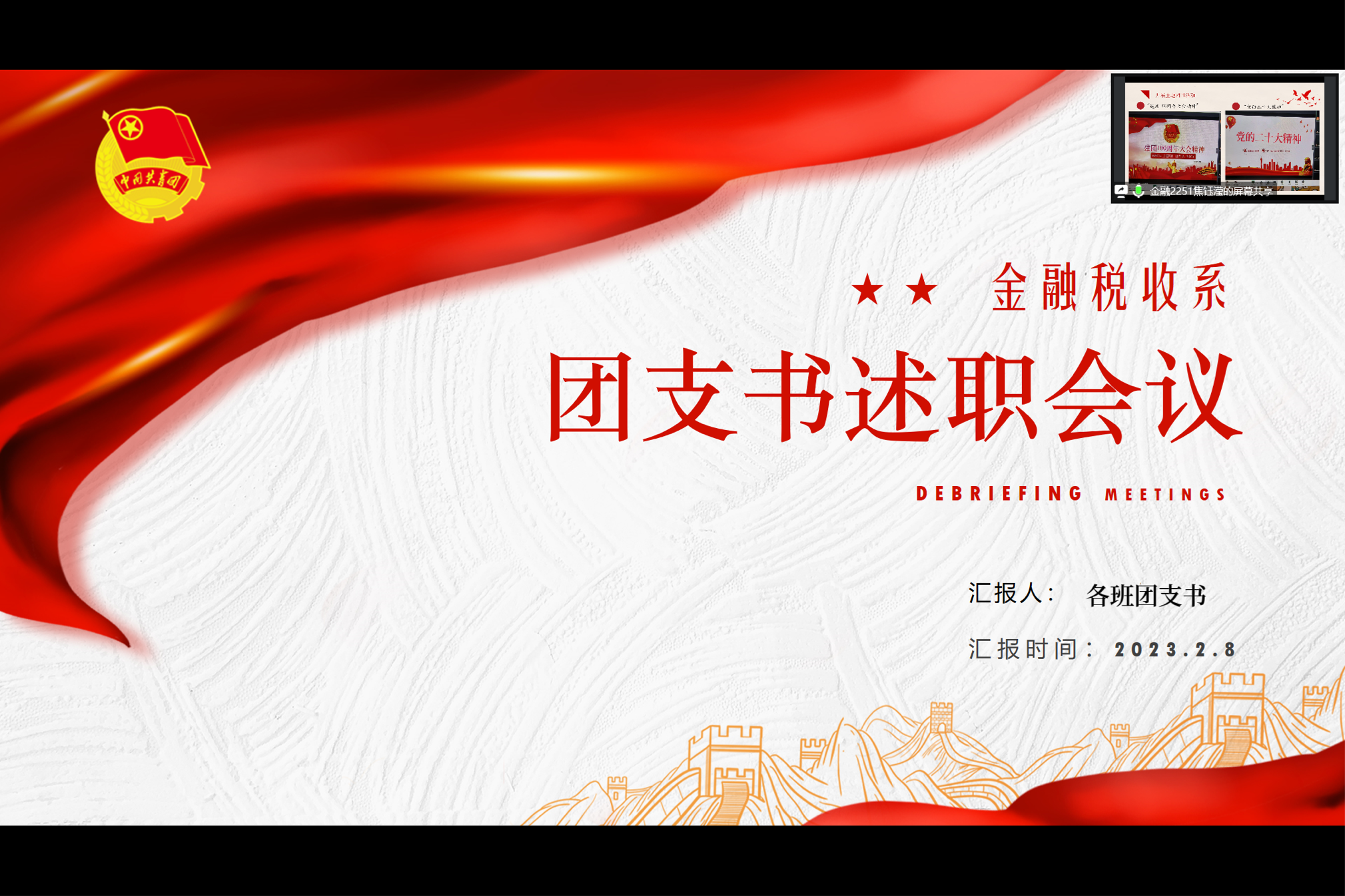 为了压实基层团支部书记责任,加强各班团支部学习交流,提高团干部服务同学的意识以及履职能力,推动基层团的引领力、组织力、服务力和贡献力协同提升。2023年2月8日下午,开云kaiyun官方网站金融税收系团总支2022年度基层团支部述职大会通过腾讯会议平台顺利召开,系团总支书记胡婉君老师、团组学生干部和各班团支部书记共44人参加。