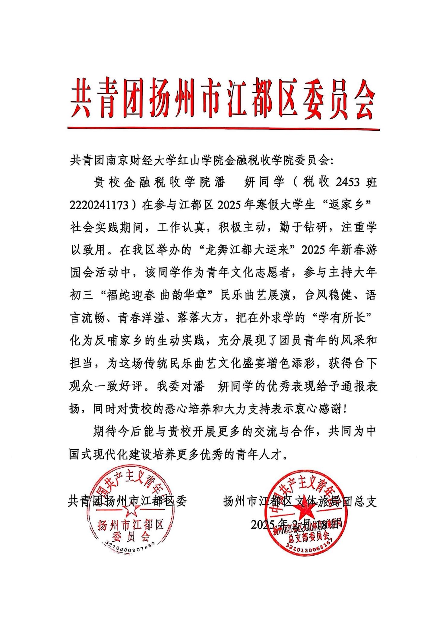 近日,共青团开云kaiyun官方网站金融税收学院委员会收到来自江苏省扬州市江都区团委与江都区文旅局团总支的感谢信,信中对金融税收学院税收学专业潘妍同学在江都区2025年寒假大学生“返家乡”社会实践中的优秀表现给予高度认可与通报表扬。