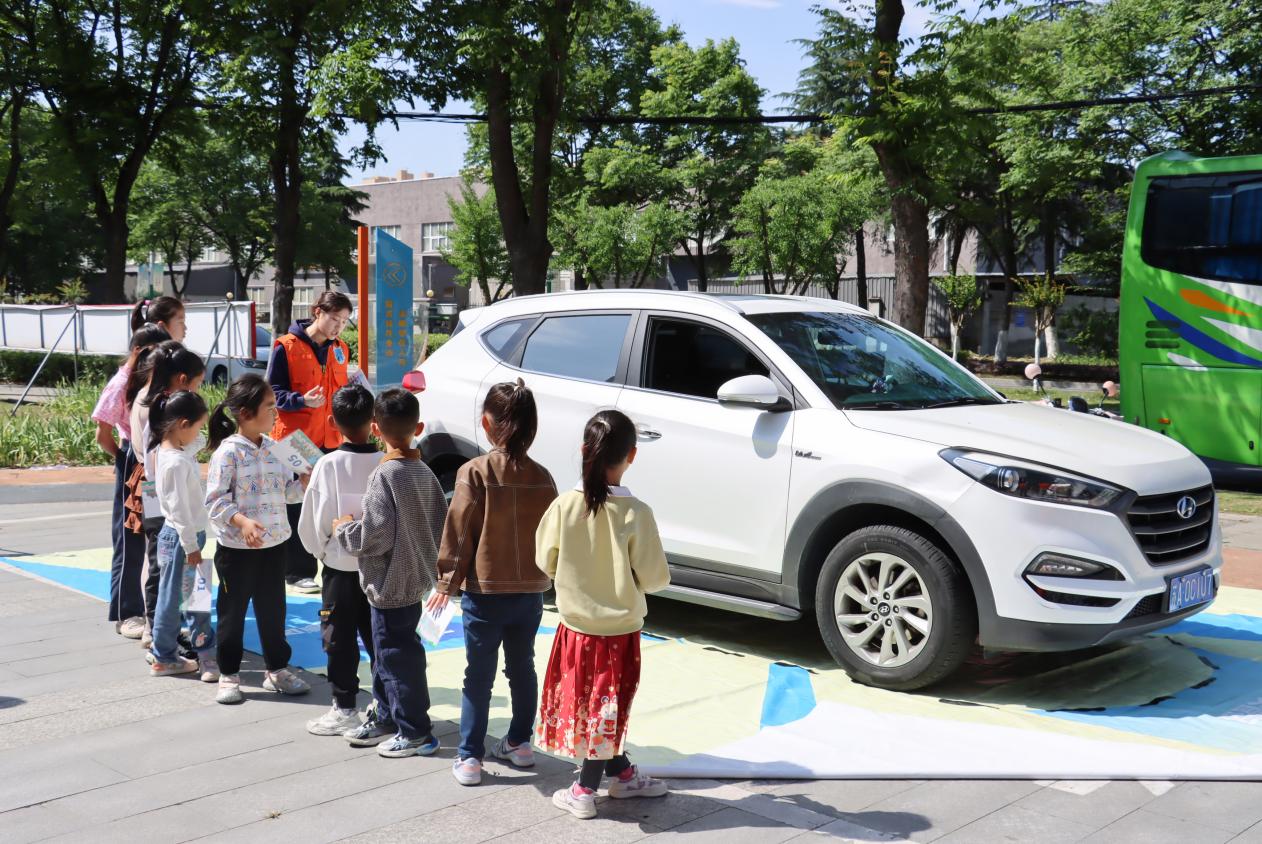 在针对“车辆盲区”这一交通安全隐患的体验区,志愿者们利用校车实物和卡通贴纸,在车身周围详细标注出盲区范围。孩子们在志愿者引导下,亲身体验蹲下身、绕车走,直观地感受到“司机看不到的地方”,从而深刻理解了“不在车前跑、不在车后留”的重要性。