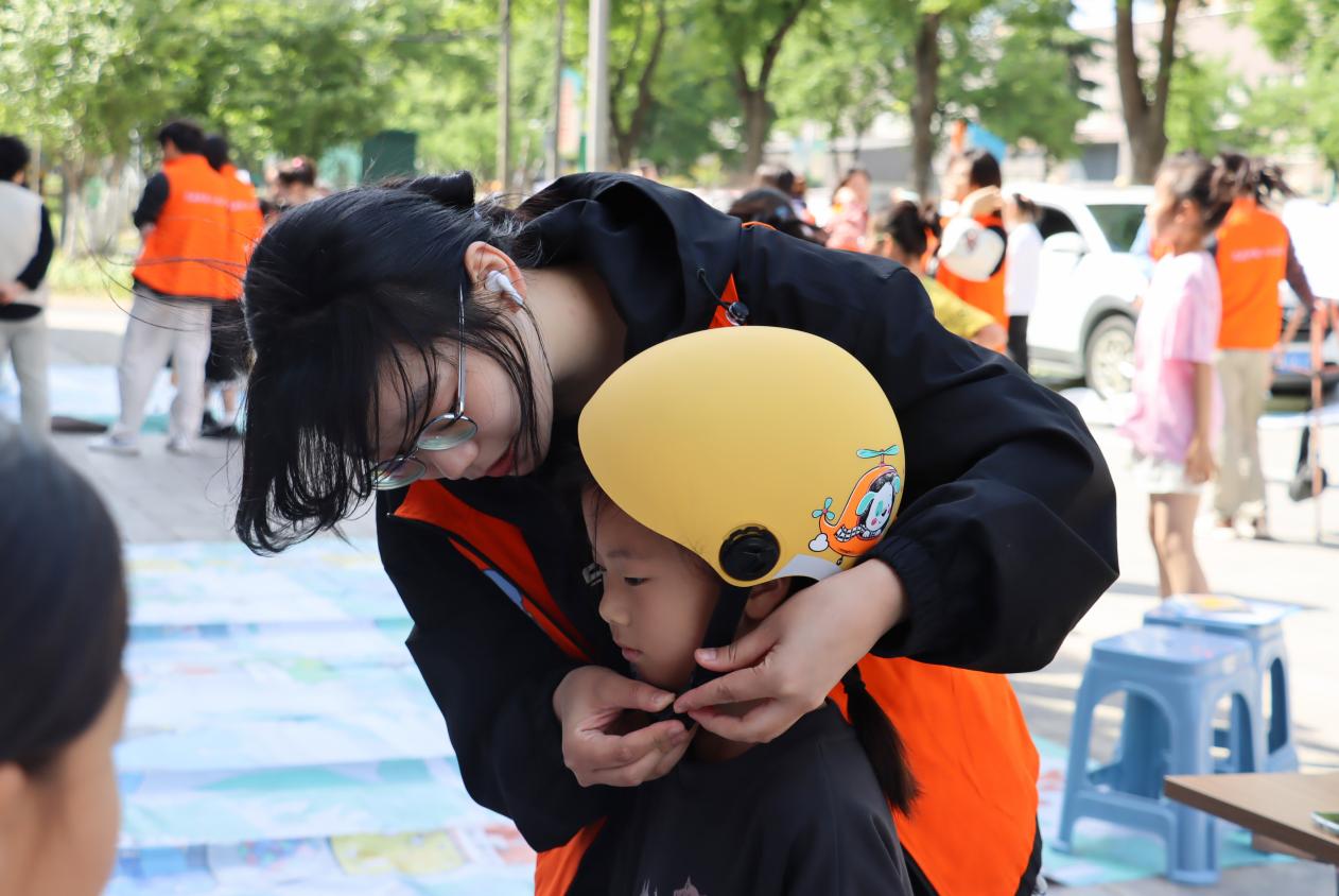 “安全头盔接力”游戏区热闹非凡。孩子们戴着可爱的卡通头盔,在障碍跑中感受头盔对头部的保护作用。在此过程中,志愿者们同步讲解“头盔怎么选、如何正确佩戴”等实用技巧,将“一盔”一带理念深植于孩子们心中,让他们在快乐的奔跑与协作中,养成良好的安全出行习惯。