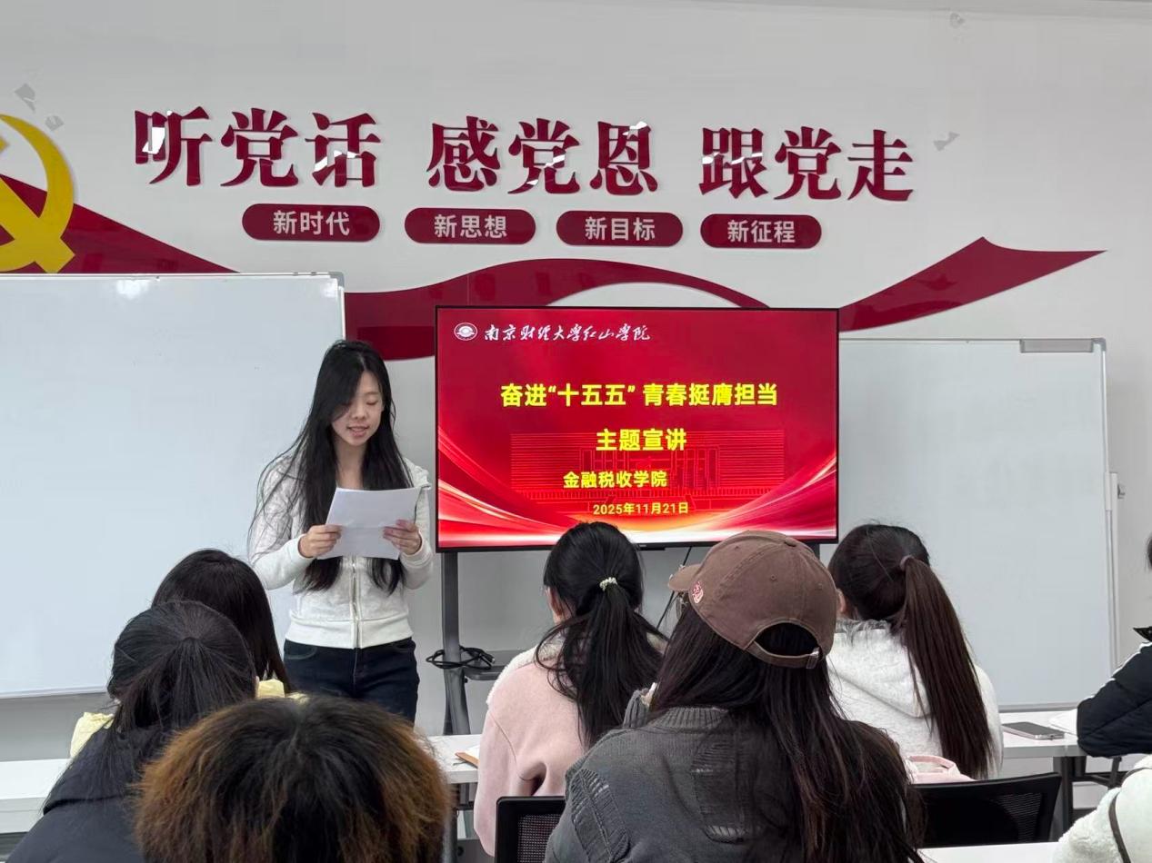 为深入学习贯彻党的二十届四中全会精神,引导青年学子准确把握"十五五"规划前期谋划的战略方向,2024年11月21日中午,金融税收学院团总支联合金融学专业党支部、保险学税收学专业党支部,在5号站党团活动室举办“奋进‘十五五’青春挺膺担当”主题宣讲会。学院各年级学生代表及入党积极分子共30余人参加活动。