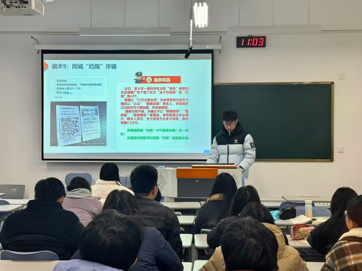 班会上,各辅导员结合近期高校发生的典型诈骗案例,深入剖析电信诈骗、网络刷单、虚假兼职、冒充客服、网络贷款等常见骗术。通过"案例讲解+手法拆解+防范提示"的方式,重点提醒学生:陌生电话不轻信、未知链接不点击、个人信息不透露、转账汇款多核实。针对大学生群体高发的"两卡"犯罪,辅导员详细解读出租、出借、出售银行卡和电话卡的法律后果,警示学生远离“帮信罪”。