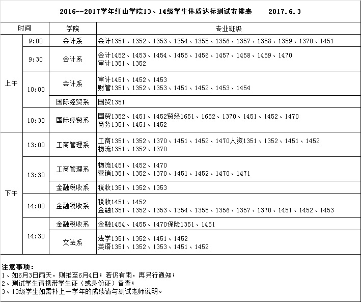 根据开云官网2013级学生返校及毕业时间的安排,现定于本学期6月3日(周六)在福建路校区田径场对2013、2014级学生进行体质达标测试,项目为:50米跑、立定跳远,以完成本学年的体育成绩评定工作。