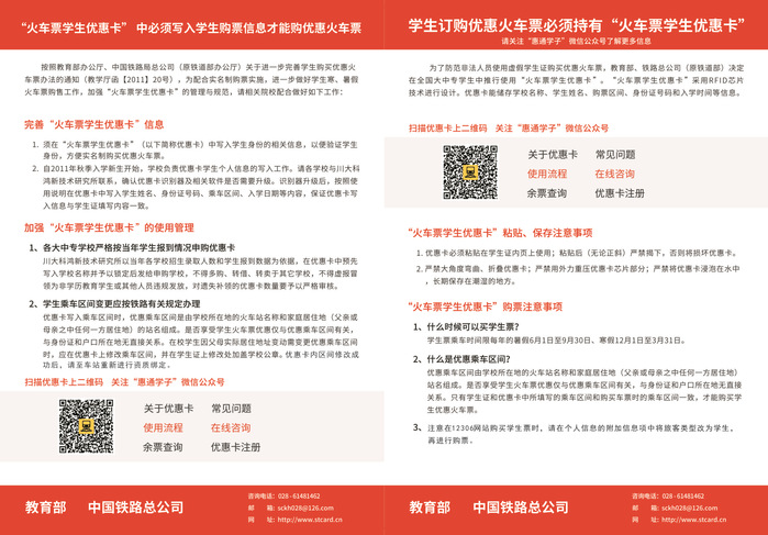 若有任何疑问,老师可致电028-61481462或技术支持电话15198059811、15198059812咨询,学生可扫描优惠卡上的二维码关注“惠通学子”微信公众号了解学生资质绑定相关内容,学生在购票或在车站绑定资质遇到问题时,可在公众号内在线咨询。