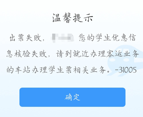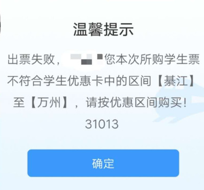 当学生买票在12306买票时提示优惠信息核验失败时(如下图1、图2所示),请学生在资质查询里仔细核查所绑定的优惠区间(如图1所示)是否是正确的站点名称,若发现绑定站点不正确或与实际乘车区间(学校--家庭)不符时,请尽快找老师修改优惠卡内站名名称,然后去车站自助机刷身份证、优惠卡重新绑定资质信息,重新绑定资质以后12306上资质信息区间修改成功后才可以买票!