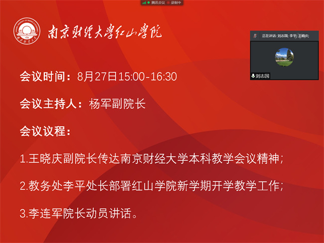 8月27日下午,开云官网通过“腾讯会议”在线召开了2021-2022学年秋季学期第一次教学工作会议。院长李连军出席会议并讲话,相关院领导参加会议,各部门、各系负责人参加会议,会议由副院长杨军主持。