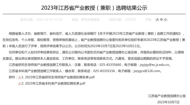 江苏省产业教授选聘工作由江苏省人才工作领导小组办公室、江苏省教育厅、江苏省科学技术厅、江苏省人力资源和社会保障厅联合组织实施,今年是第二次开展本科类产业教授选聘。