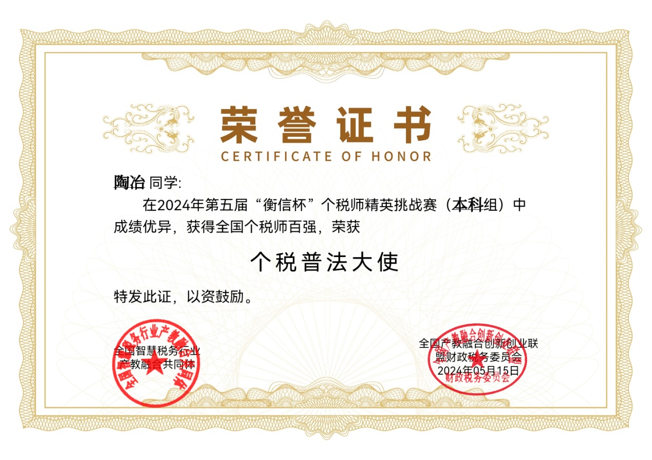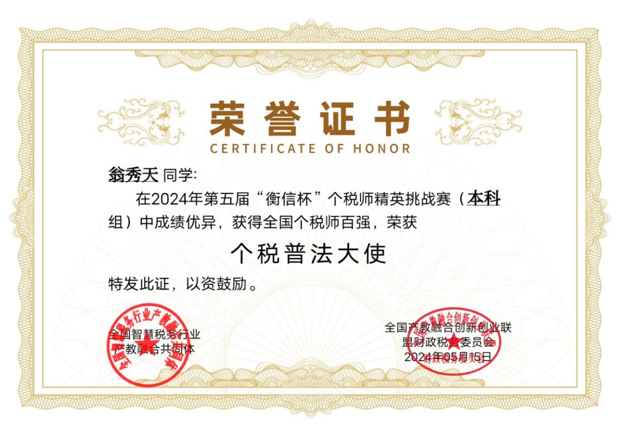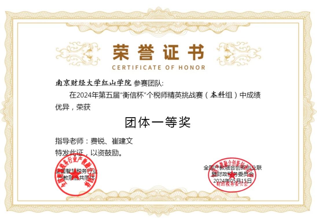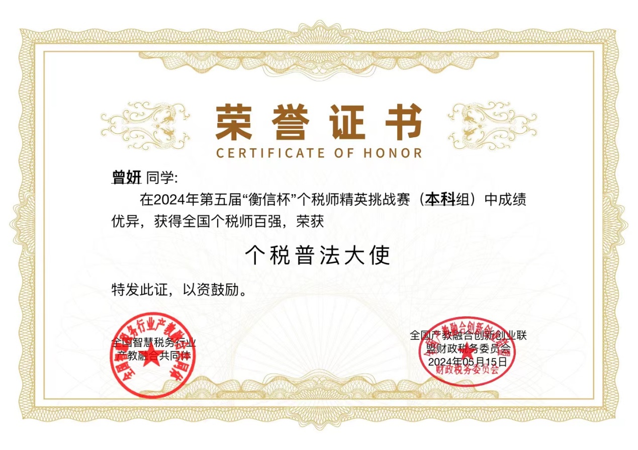 2024年5月12日,由中国企业财务管理协会、衡信教育主办的第五届“衡信杯”全国个税师精英挑战赛落下帷幕。由税收专业学生组成的开云官网代表队荣获本科组团体一等奖,7名同学入选全国个税师精英挑战赛百强榜。