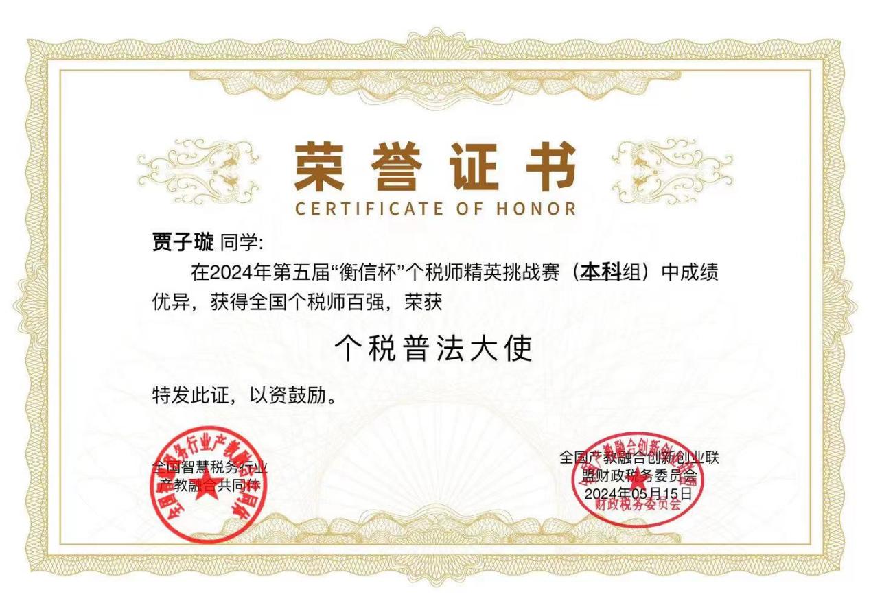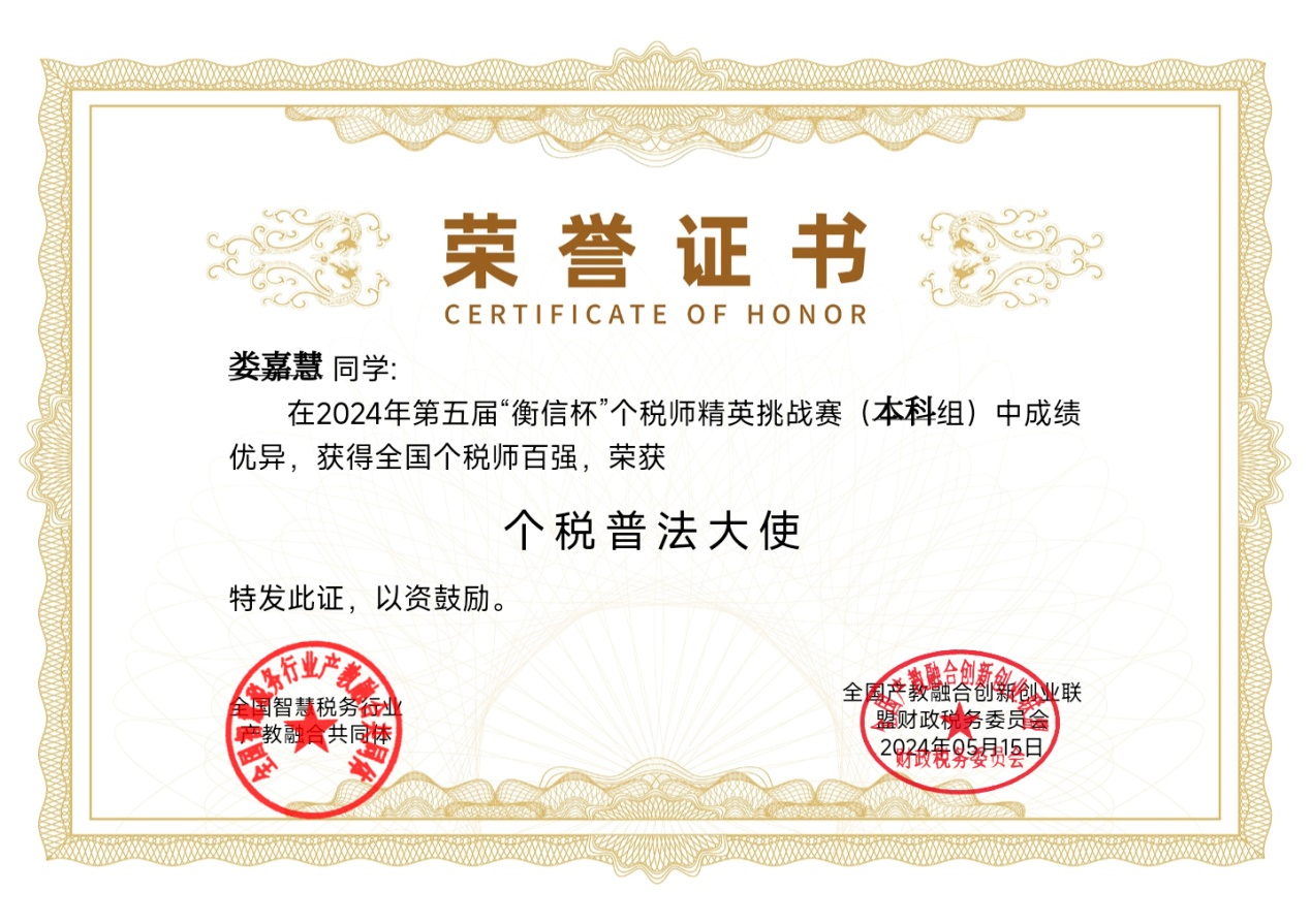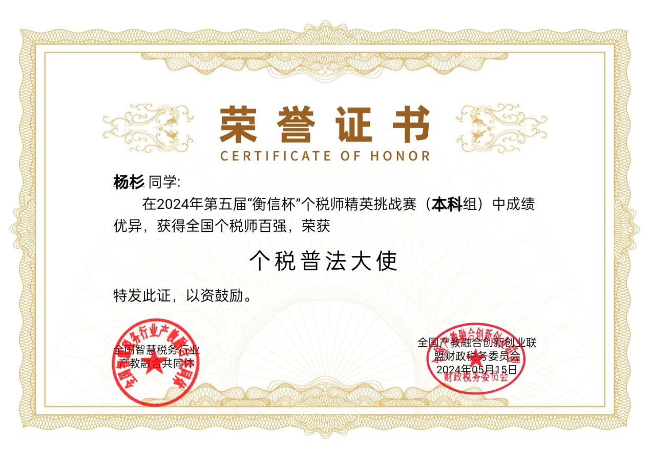 2024年5月12日,由中国企业财务管理协会、衡信教育主办的第五届“衡信杯”全国个税师精英挑战赛落下帷幕。由税收专业学生组成的开云官网代表队荣获本科组团体一等奖,7名同学入选全国个税师精英挑战赛百强榜。