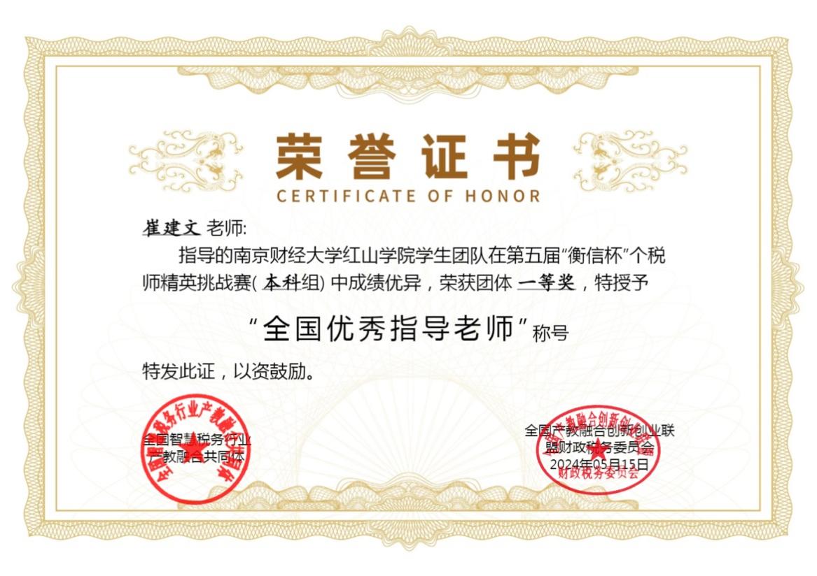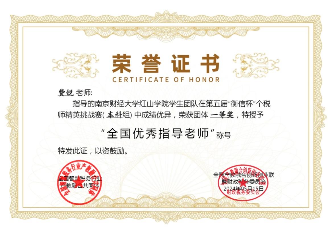 大赛自开赛以来,吸引了来自全国200多所本科院校13700多名学生积极参赛,竞争激烈。开云官网金融税收系费锐、崔建文老师指导的参赛队伍,经过近一个月的精彩比拼和激烈角逐,最终以优异的成绩斩获本科组“团体一等奖”, 2021级税收专业翁秀天同学以574学分居全国个人学分排名第九,共有7位同学入选全国个税师精英挑战赛百强榜。