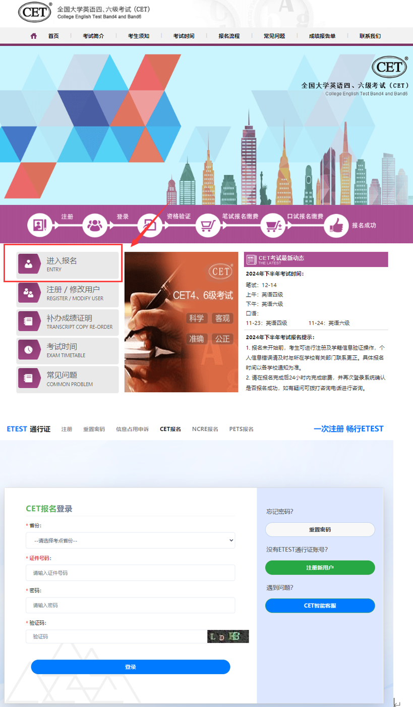 1.注册完ETEST通行证后,考生进入报名网站http://cet-bm.neea.edu.cn,点击“进入报名”按钮,输入账号密码登录。