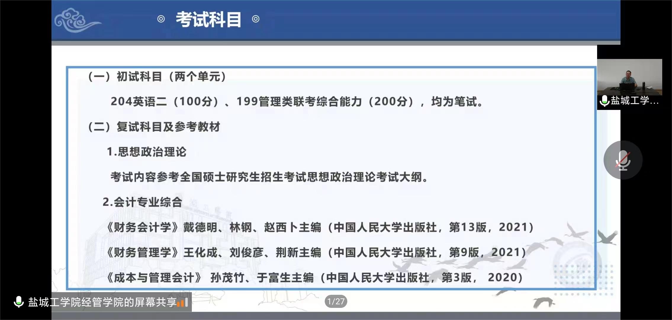 9月28日下午,会计系通过线上平台腾讯会议举办盐城工学院会计硕士(MPACC)招生宣讲会,我系孙迪一老师负责系部洽谈工作,盐城工学院经管学院李争光副教授和薛勤老师应邀主讲,众多大三大四年级学生积极参加。